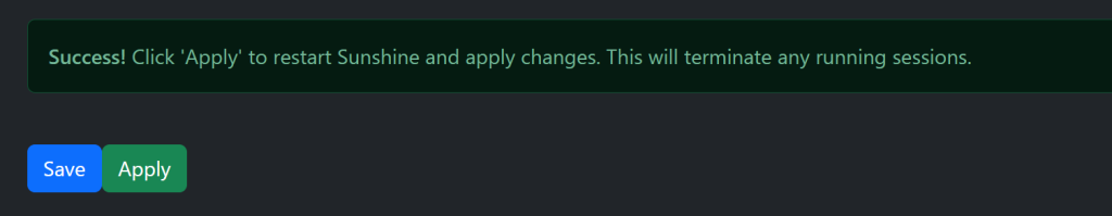 Saveボタンを押すと、Applyボタンを押して、Sunshineを再起動し変更を適用します。