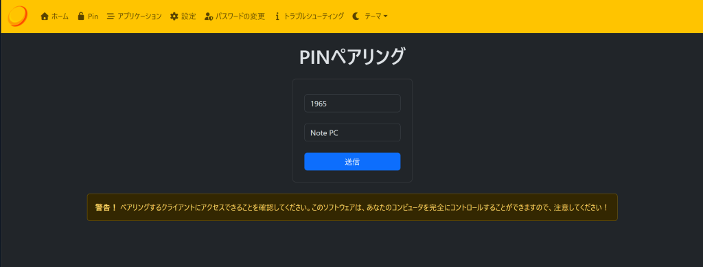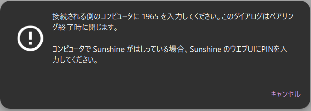 SunshineのPINでMoonlight側の接続許可を行います。