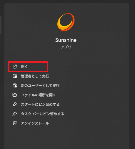 インストールが完了すると、Sunshineが実行できます。