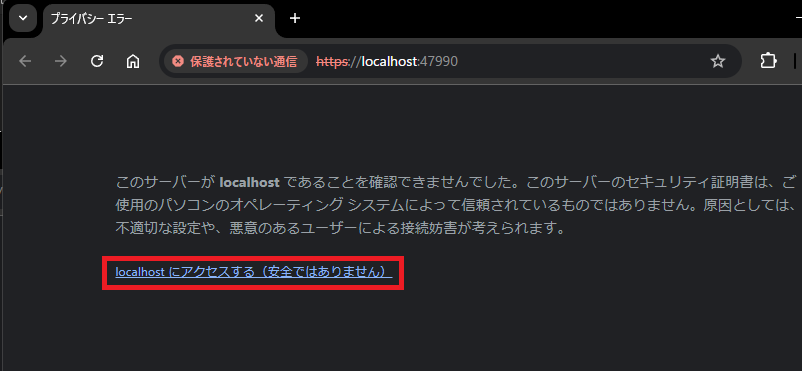 「詳細」をクリックし、「localhost にアクセスする(安全ではありません)」をクリックします。