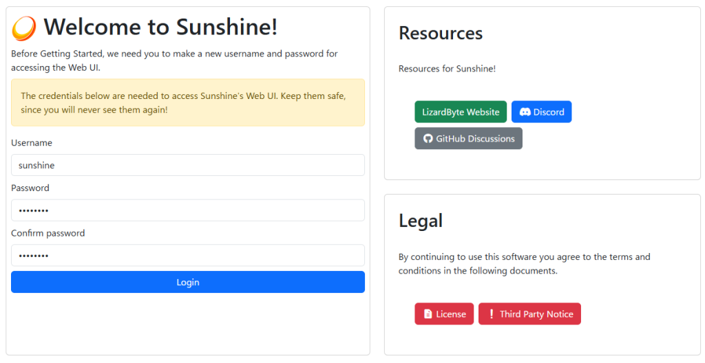 localhostにアクセスすると、Sunshineを使い始めるためのユーザー名とパスワードの設定画面が表示されます。