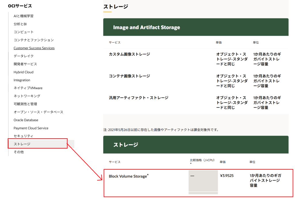 URL: https://www.oracle.com/jp/cloud/price-list/ - ページ内で「Block Volume Storage」または「ブロック・ボリューム・ストレージ」という項目を探します。
